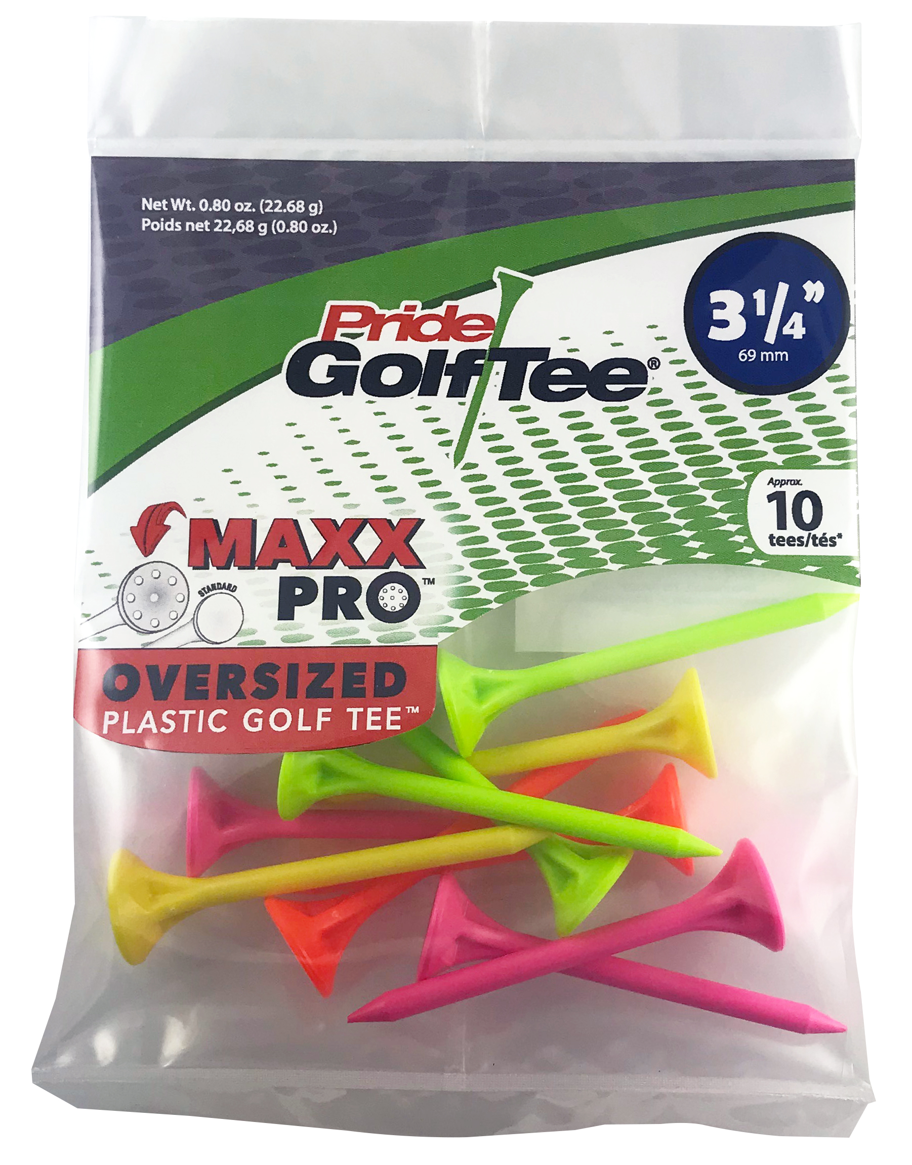 The Pride Sports MaxxPro Oversized golf tees are engineered with a larger head to allow easier placement of the golf ball. The durable plastic golf tee has built in dimples to make sure the golf ball sits high on the tee for consistent drive distances.