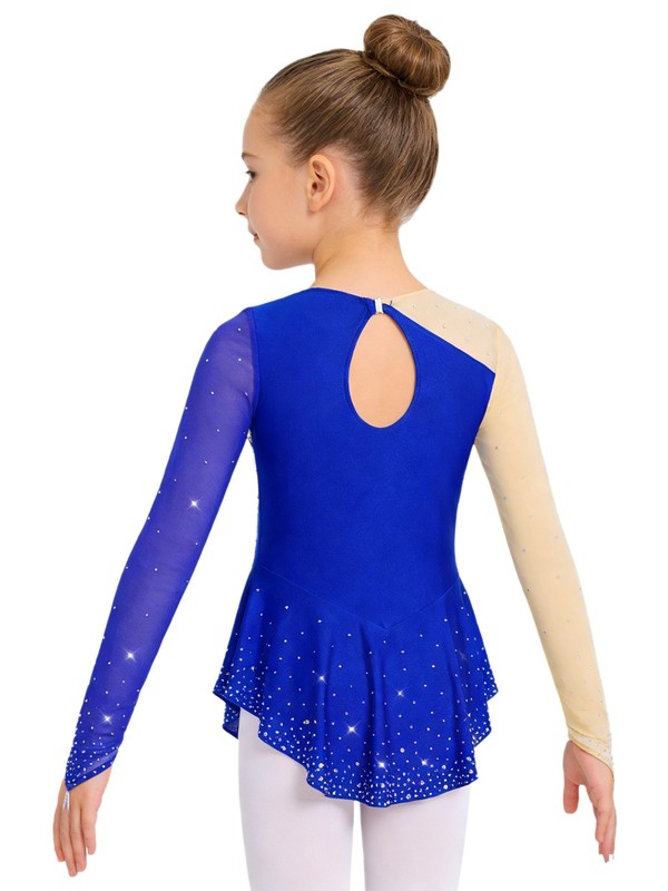 The asymmetrical hem gives the dress a contemporary and fashionable edge, making it suitable for figure skating, dance performances, or other special occasions.