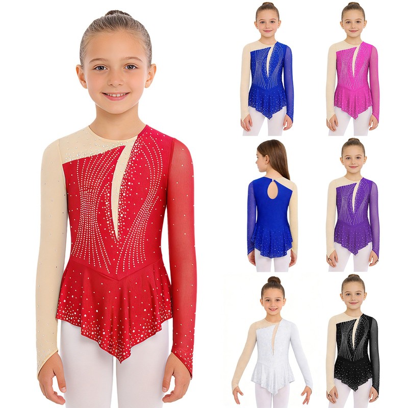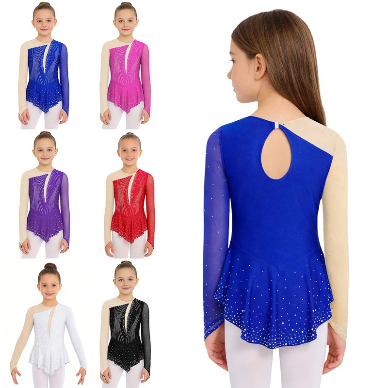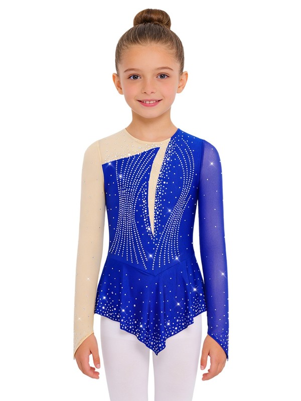 Shiny rhinestones and mesh patchwork create a dazzling and eye-catching effect, making the dress perfect for standing out on the ice or in the dance studio.