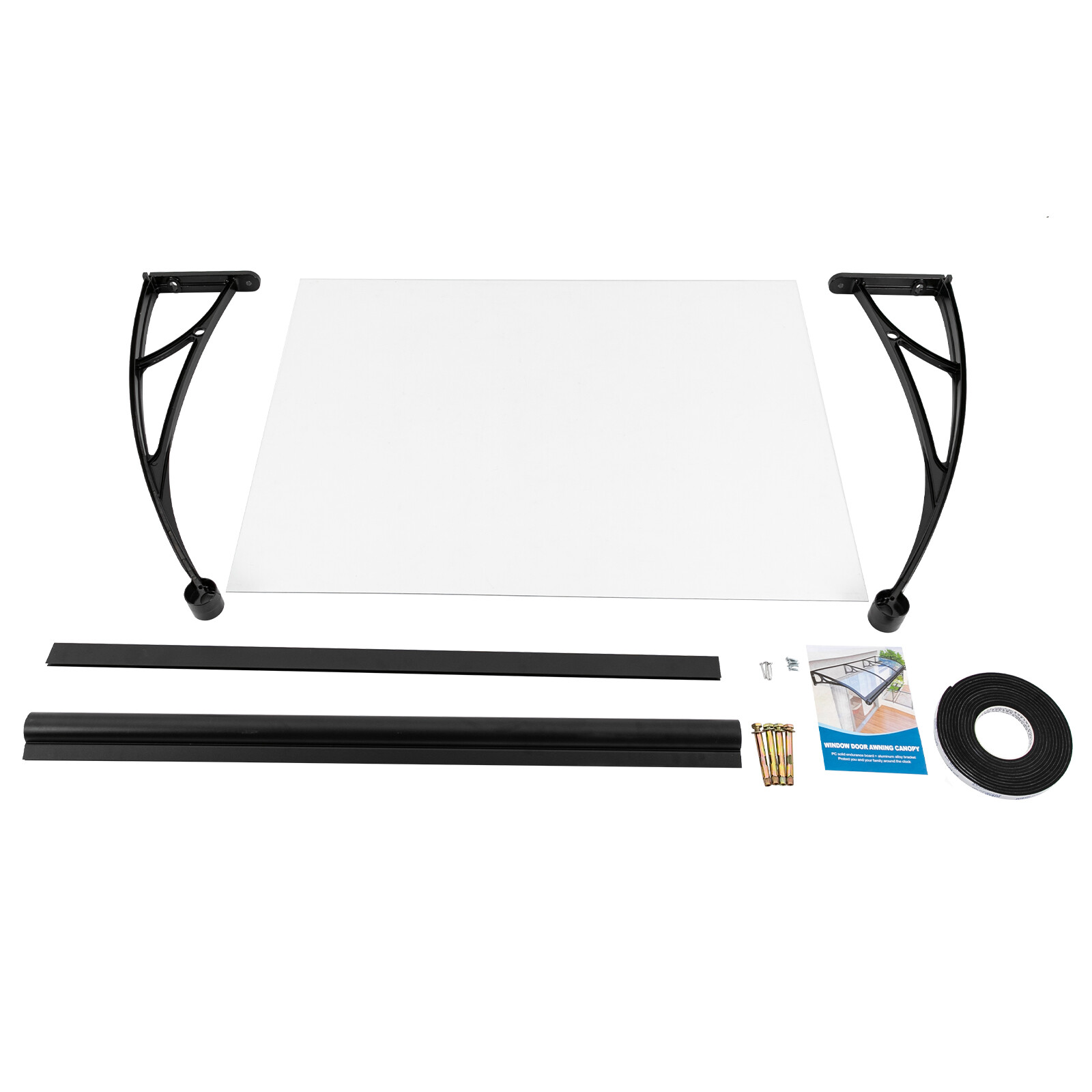 This product is suitable for porches, windows, garden balconies and garages to avoid damage caused by rain, snow and sunlight.Made to Last: This product is made of a high-quality spray-treated aluminum alloy bracket and PC shed panel, which does not easily rust, aging and corrosion, and can be used for a long time without frequent replacement.Strong Load-bearing Capacity: The load-bearing capacity of the product is around 187.39lbs, you don't need to worry about the problem of snow cover in winter, which can effectively prevent falling objects from height and ensure the safety of use.Efficient Drainage: The enlarged sink design can effectively prevent water leakage and solve the problems of water accumulation and overflow in stormy weather. The two side spouts are also designed to minimize leading edge dripping.Excellent Function: It not only has the function of drainage, but also has the function of UV protection. It can withstand temperature changes from -40 to 248 ℉, durable and powerful.Modern Appearance: The product's simple curved structure and classic color scheme are very modern and can be combined with most decorating styles.Simple Installation: Simple construction, complete mounting accessories, and detailed English installation instructions help you install and use it quickly.Effortless Cleaning: Its smooth surface and curved structure are less likely to allow rain, snow or debris to accumulate, thus reducing maintenance and cleaning frequency and saving time and effort.Good Customer Service: We aim to provide quality products and services. If you have problems, please feel free to contact us. We will reply and solve the problem for you as soon as possible.