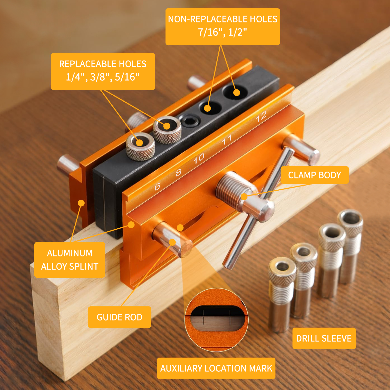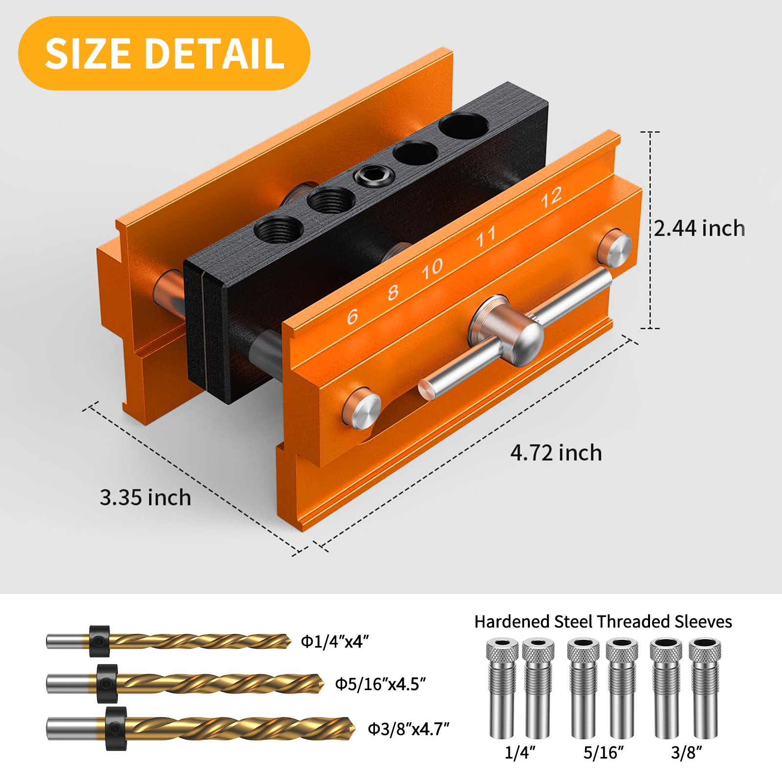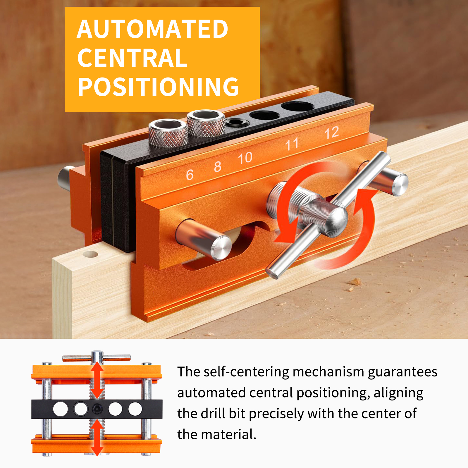 Accurate Self-centeringBy rotating the locking threaded rod, the aluminum alloy splints on both sides can be gathered or separated at the same time, realizing the accurate self-centering function. | Wide Clamping RangeThe self centering dowelling jig plus can hold workpieces from 0.4'' to 2.4''. | Accurate Positioning of Drilling HolesQuickly and accurately locate where you want to drill, saving your work time. | Hardened Steel Drill SleeveThe set provides six hardened steel threaded sleeves, two for each of 1/4'', 5/16'' and 3/8''. |