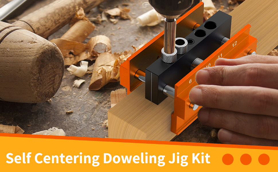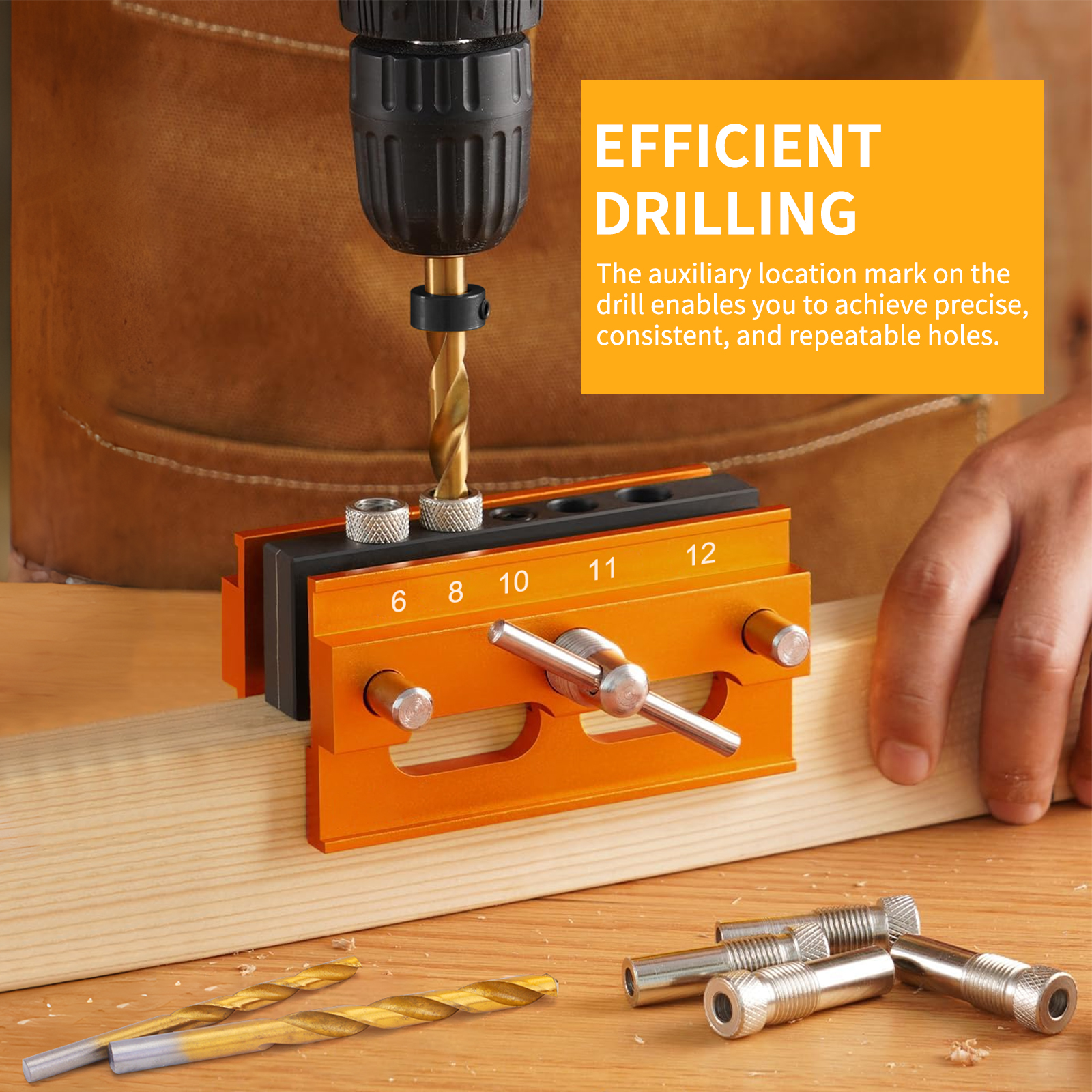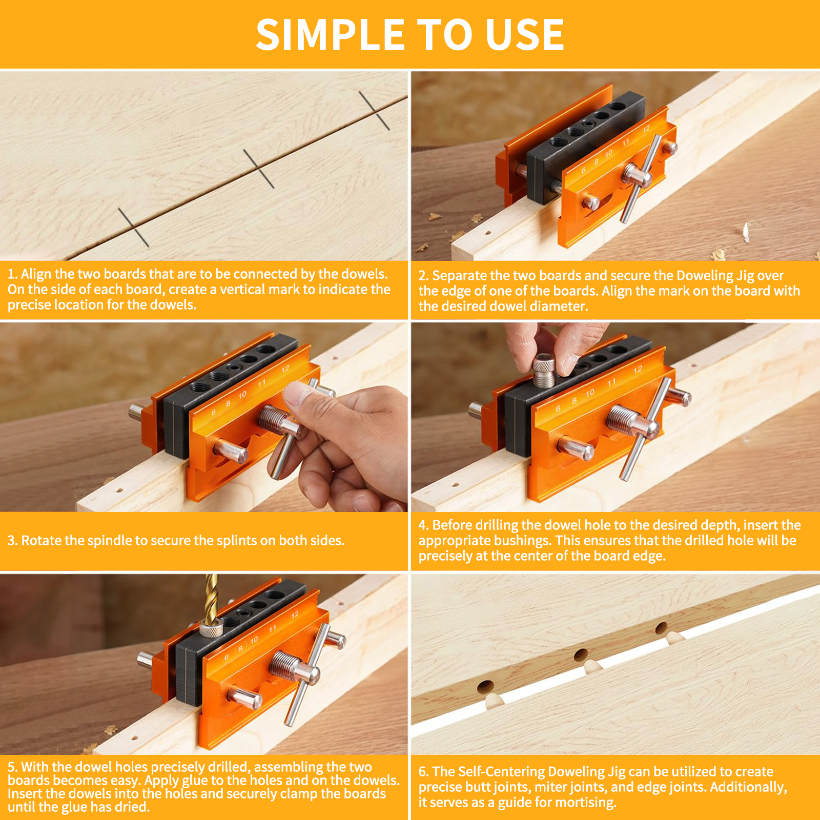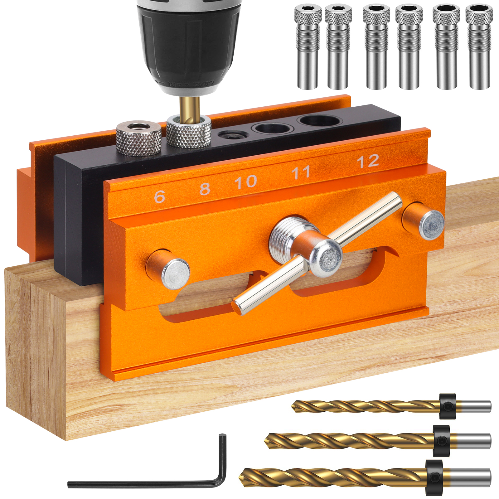 Accurate Self-centeringBy rotating the locking threaded rod, the aluminum alloy splints on both sides can be gathered or separated at the same time, realizing the accurate self-centering function. | Wide Clamping RangeThe self centering dowelling jig plus can hold workpieces from 0.4'' to 2.4''. | Accurate Positioning of Drilling HolesQuickly and accurately locate where you want to drill, saving your work time. | Hardened Steel Drill SleeveThe set provides six hardened steel threaded sleeves, two for each of 1/4'', 5/16'' and 3/8''. |
