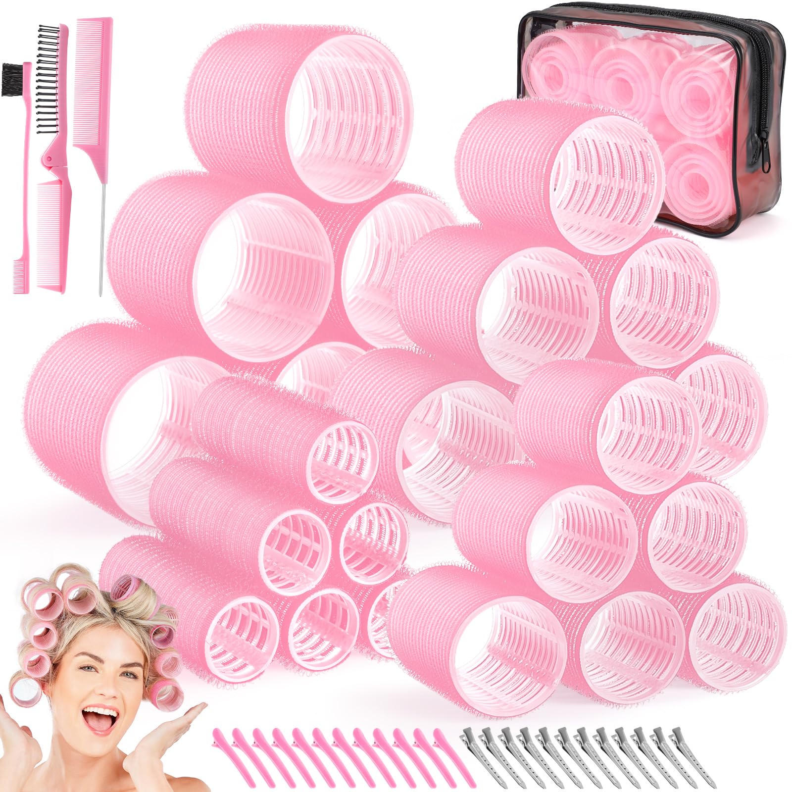 Paquete económico: El set incluye 24 rulos rosas (4 tamaños diferentes), 24 pinzas para el cabello, 3 herramientas de peinado y 1 bolsa de almacenamiento. La cantidad es suficiente para usarlos durante mucho tiempo o para regalar a familiares y amigos.