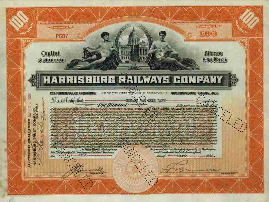 Rare Eisenbahn - Aktie !!! Orginalpapier - siehe Bild - Einzelstück -- der Harrisburg Railways Company vom 22. März 1928. Harrisburg ist die Hauptstadt des US-Bundesstaates Pennsylvania. Die Stadt liegt im Dauphin County im Südosten des Bundesstaates am Susquehanna River. Bereits 1912 gegründet. Betrieb der Strassenbahnen im Bezirk Harrisburg, ab 1962 auch Busvetrieb. Die Harrisburg Railways Company überträgt 1973 ihre Vermögenswerte an die Capital Area Transit . Orginalunterschriften. Dekorativer Druck mit Vignette "Capitol Harrisburg" der American Bank Note Company. US - Papier, in normaler guter Erhaltung: VF+. --- Siehe Großbild --- !! Papier, in normaler US - Erhaltung: VF. Sammlerfreundlicher Sonderpreis !!