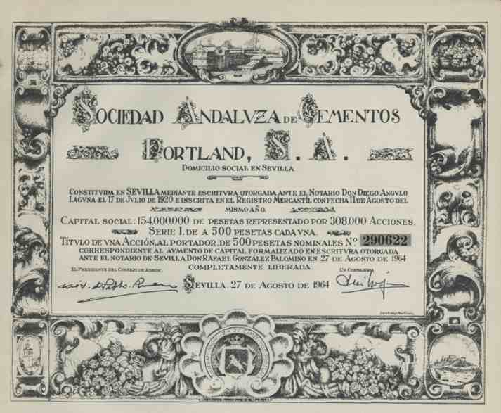 Dekorativer AKTIEN - KLASSIKLER !! Originalaktie -- siehe Archivbild -- der Sociedad Andalvza de Cementos Portland über 500 Pesetas, Sevilla, Spanien vom 27. August 1964. Die Gründung erfolgte bereits am 17. Juli 1920. Betrieb eines Zementwerkes. Herstellung von Portland - Zement. Dekorativer Druck mit Fabrikabbildung und Wappen im Zierrand. Gedruckt bei Graficas Reunidas S.A, in Madrid. Papier , in guter Erhaltung: VF+. Sammlerfreundlicher Startpreis !