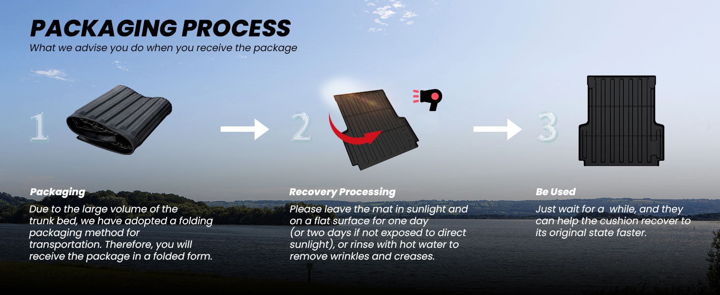 LASFIT truck bed mat is folded into the package, the crease and hump might be happened. Please leave the mat in the sun for a day (or two days in the shadow).