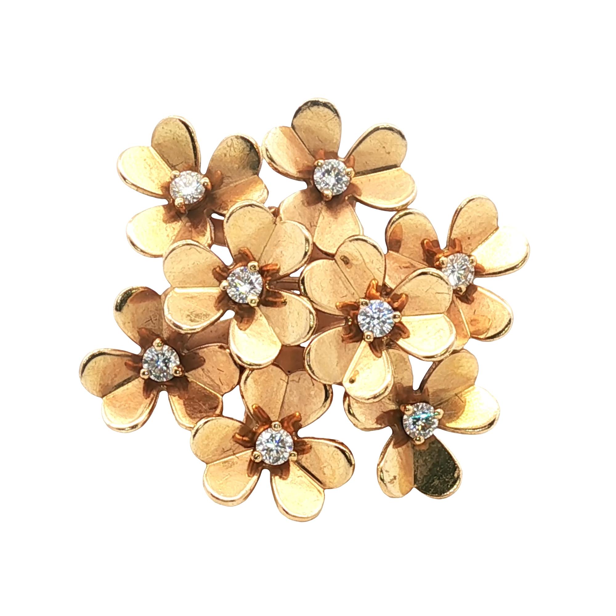 An exquisite expression of refined elegance, this Van Cleef & Arpels Frivole ring is crafted in 18 karat rose gold and designed in the coveted eight-flower motif, creating a bold yet feminine statement. Each delicately sculpted bloom features heart-shaped petals set with brilliant-cut diamonds, forming a radiant composition that shimmers beautifully with movement. The dimensional arrangement of the eight flowers enhances the ring’s presence on the hand while maintaining the Maison’s signature lightness and grace. Sized at 52 (US size 6), this piece is a striking blend of craftsmanship, brilliance, and iconic design, perfect for both everyday luxury and special occasions. Weight: 12 grams.