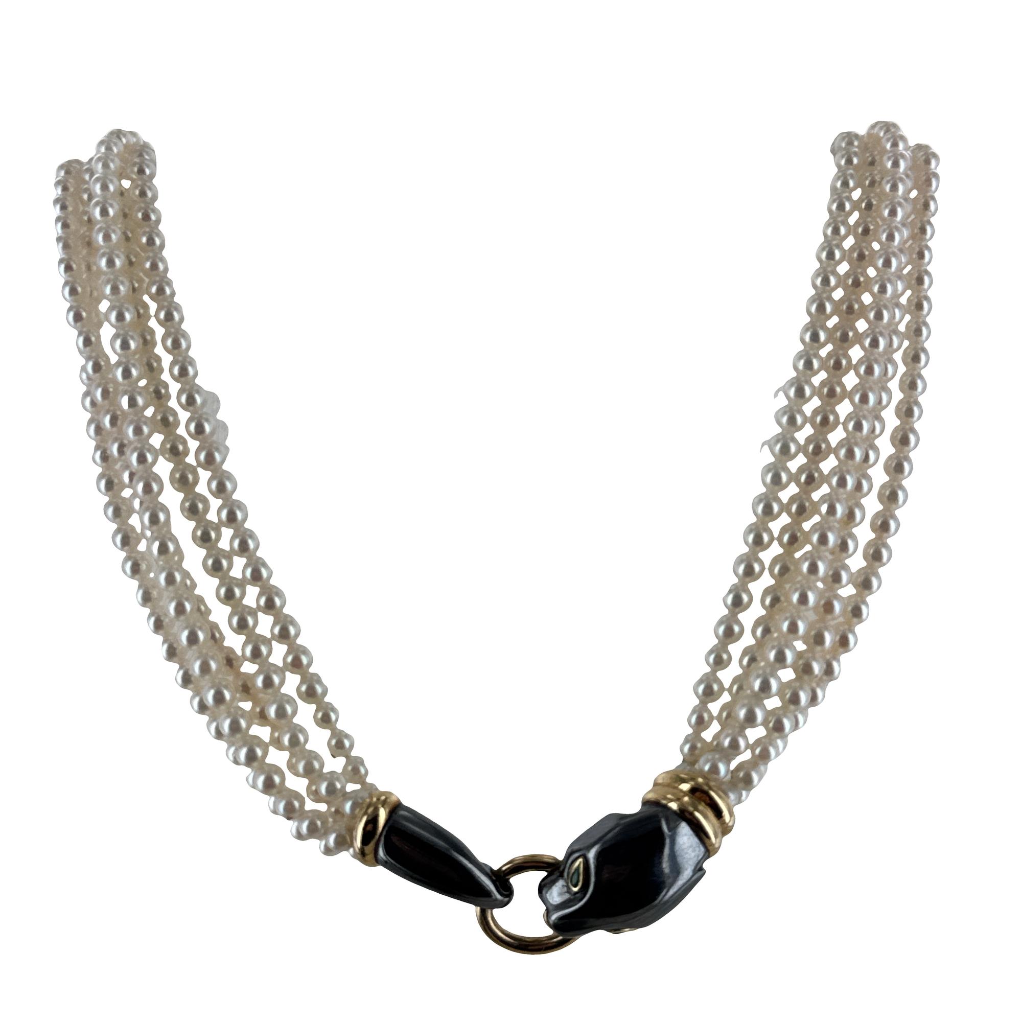 A stunning example of Cartier’s iconic artistry circa late 20th century, this 18 karat yellow gold Panthère necklace features five lustrous strands of pearls, elegantly secured by a sculptural panther clasp with sparkling emerald eyes. Measuring 16 inches in length, the necklace combines classic elegance with Cartier’s signature bold design, offering a striking statement piece that sits beautifully at the neckline. The harmonious interplay of warm gold, radiant pearls, and the jewel‑accented panther clasp creates a timeless and collectible work of wearable art.