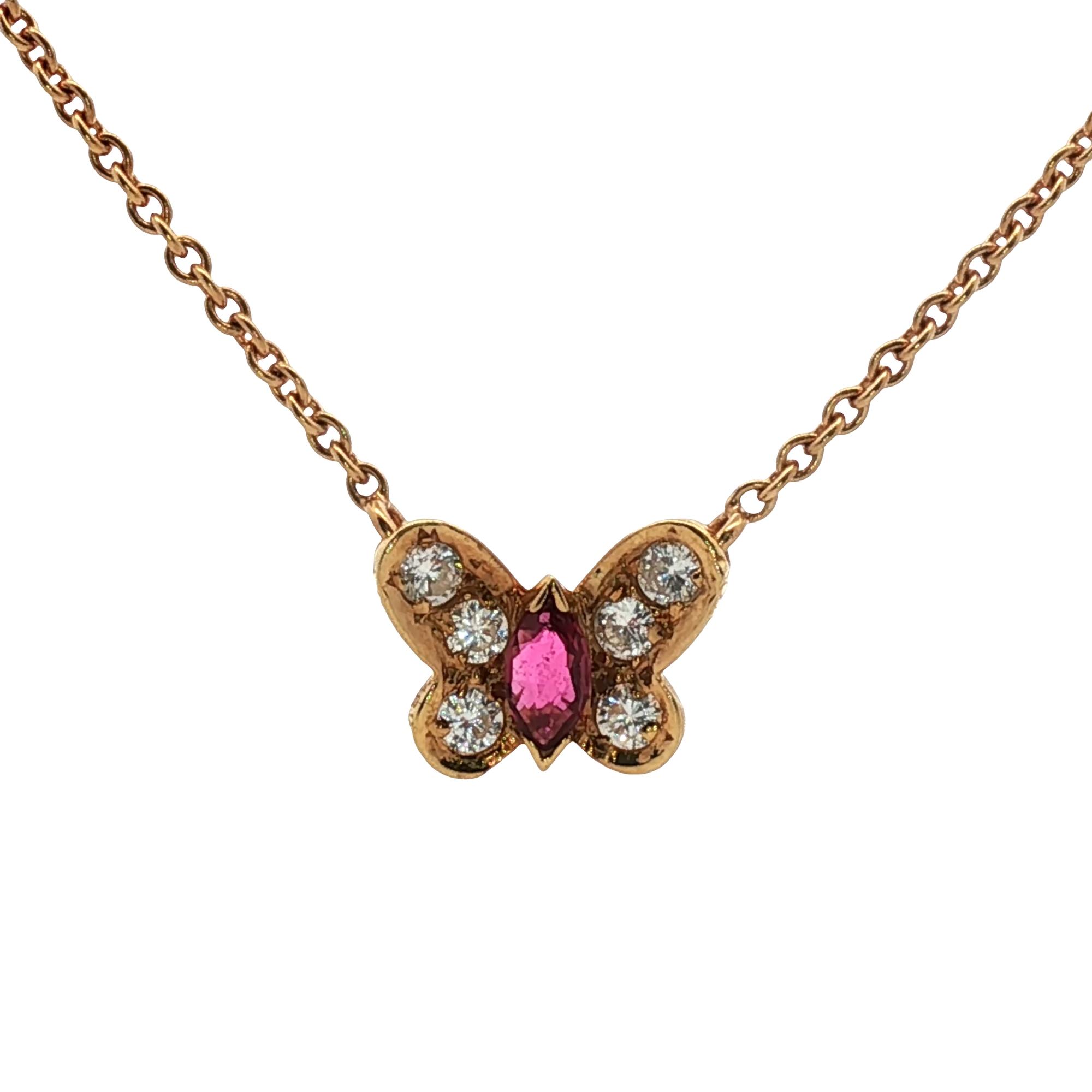 A charming and collectible design from Van Cleef & Arpels, this vintage Papillon butterfly pendant is crafted in 18 karat yellow gold and features a delicate, nature-inspired silhouette. The butterfly is set with six sparkling diamonds that add subtle brilliance to the wings, while a single ruby accent brings a vibrant touch of color and serves as a signature focal point. Elegant yet whimsical, the design reflects Van Cleef & Arpels’ long-standing inspiration from flora and fauna, a theme that has been central to the maison since the early 20th century . Measuring 17 inches in length and presented with its original box, this piece offers both timeless beauty and collectible appeal, perfect for everyday wear or as a meaningful addition to a fine jewelry collection. Weight: 4.8 grams.