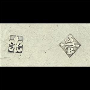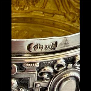 This is a German solid silver box of .800 fine silver. It is a rendition of a French box with pseudo French marks. The top looks repousse, but it is actually cast, or stamped. The banding on the side is stamped decoration, not done by hand. The bottom has a pseudo French hallmark, and a faux Martin Guillaume Biennais mark. Even though it’s a reproduction, it is still a beautiful box, and a great example of German repro of French silver. It is 2 7/8” diameter, 1 7/16” tall, and weighs 3.6 troy ounces. It is in excellent condition.