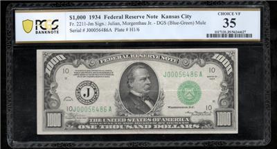 What we have here is an Extremely Fine $1000 Kansas City note. If you are looking at this note, you know that $500's and $1,000's are awesome. This note is a Freidberg 2211-J. It has been graded by PCGS as Very Fine 35. You don't have to trust me concerning the grade of this note, you only have to trust PCGS.