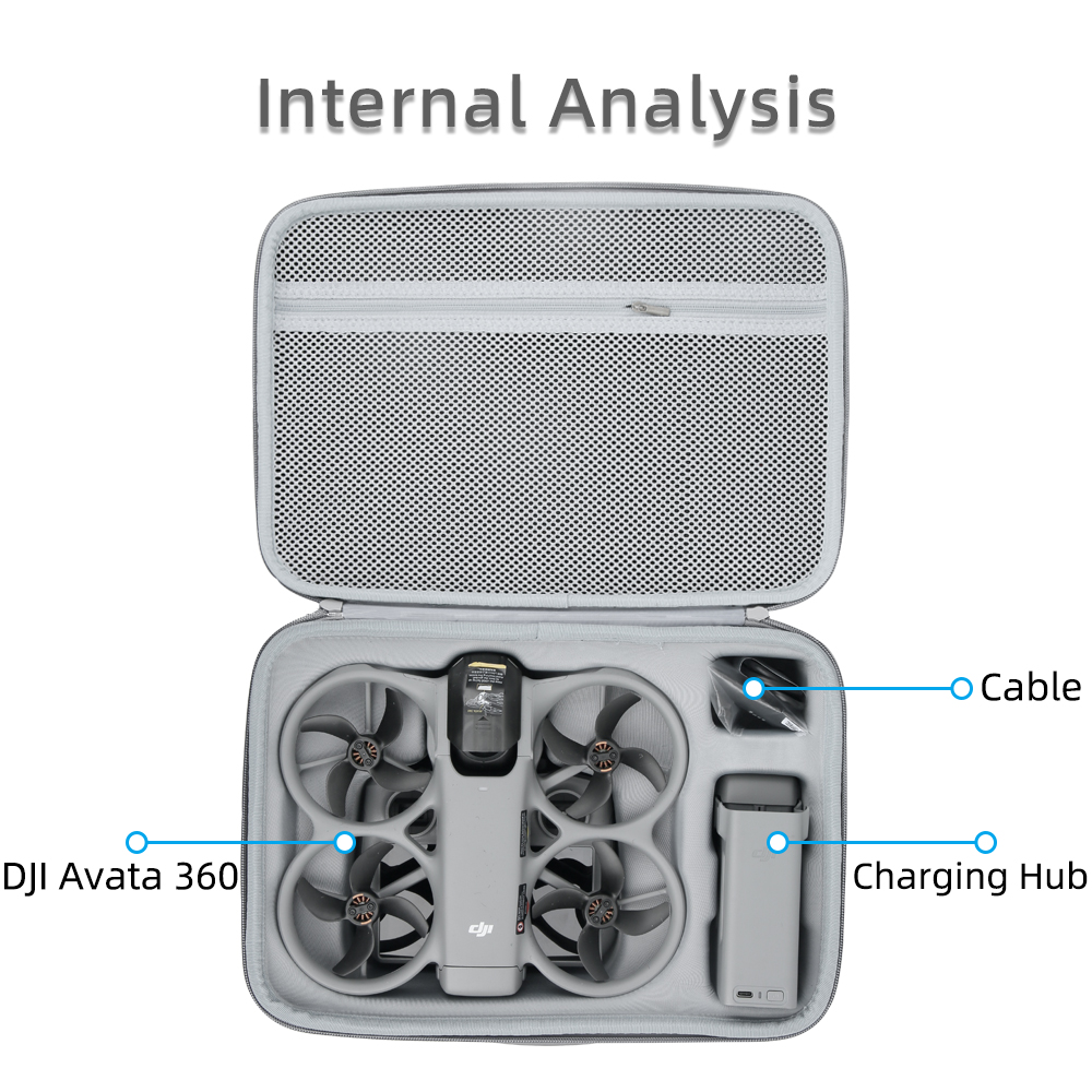 Holds the Avata 360 drone, RC 2 remote controller, charging hub, batteries, propellers, charging cables, and other accessories.