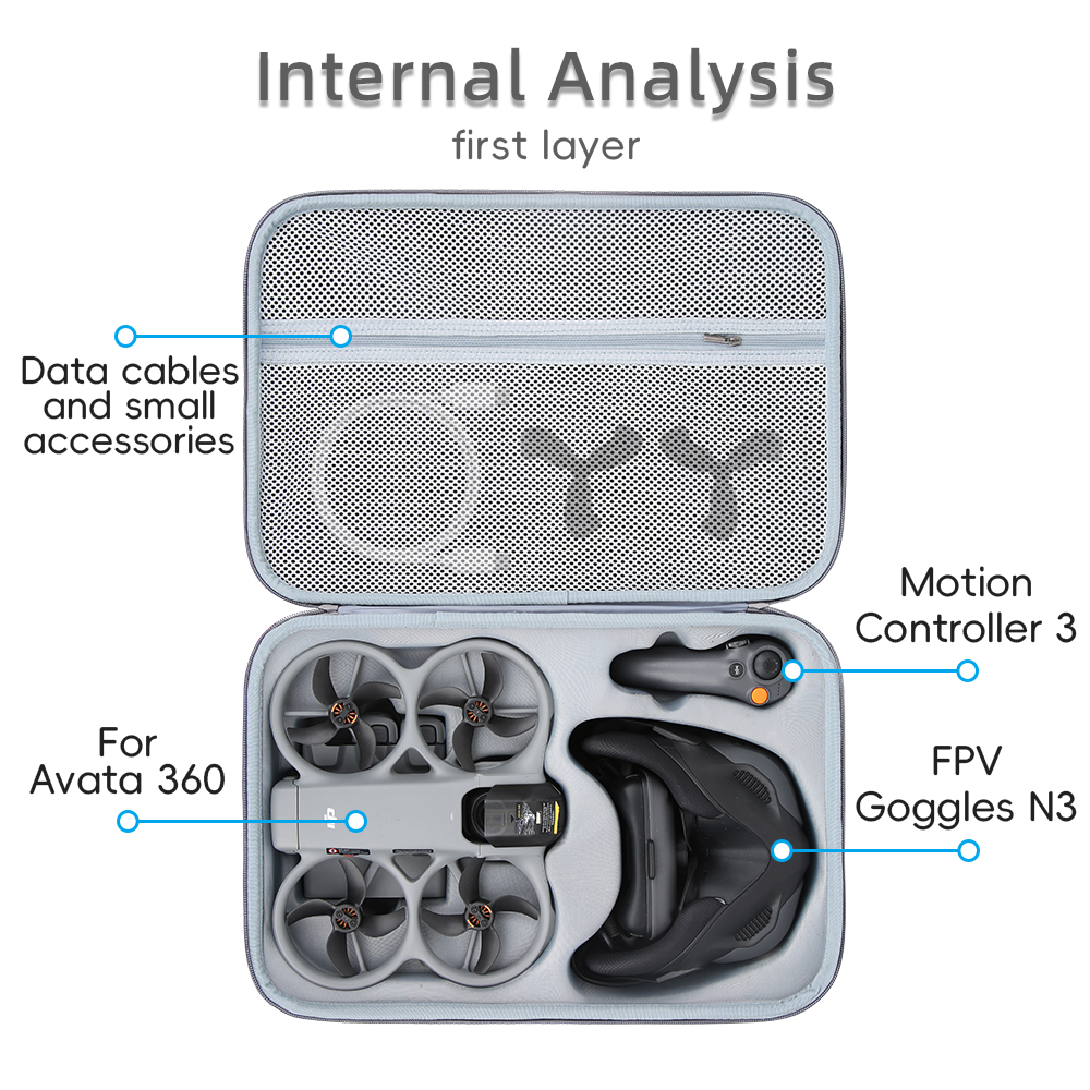 1. A waterproof storage case designed specifically for the AVATA 360, compatible with the AVATA 360 Motion Fly More Combo. The case is molded to the exact dimensions of the drone, ensuring a secure fit. It can hold the AVATA 360, G-N3 goggles, battery charging hub, FPV controller, 65W charger, and 2 batteries. Additionally, the lower compartment of the AVATA 360 case serves as customizable storage. Its dual-layer design accommodates the RC2 controller (with joysticks), spare propellers, data cables, and more. The entire kit fits neatly into one case, allowing you to fly right out of the box when traveling.