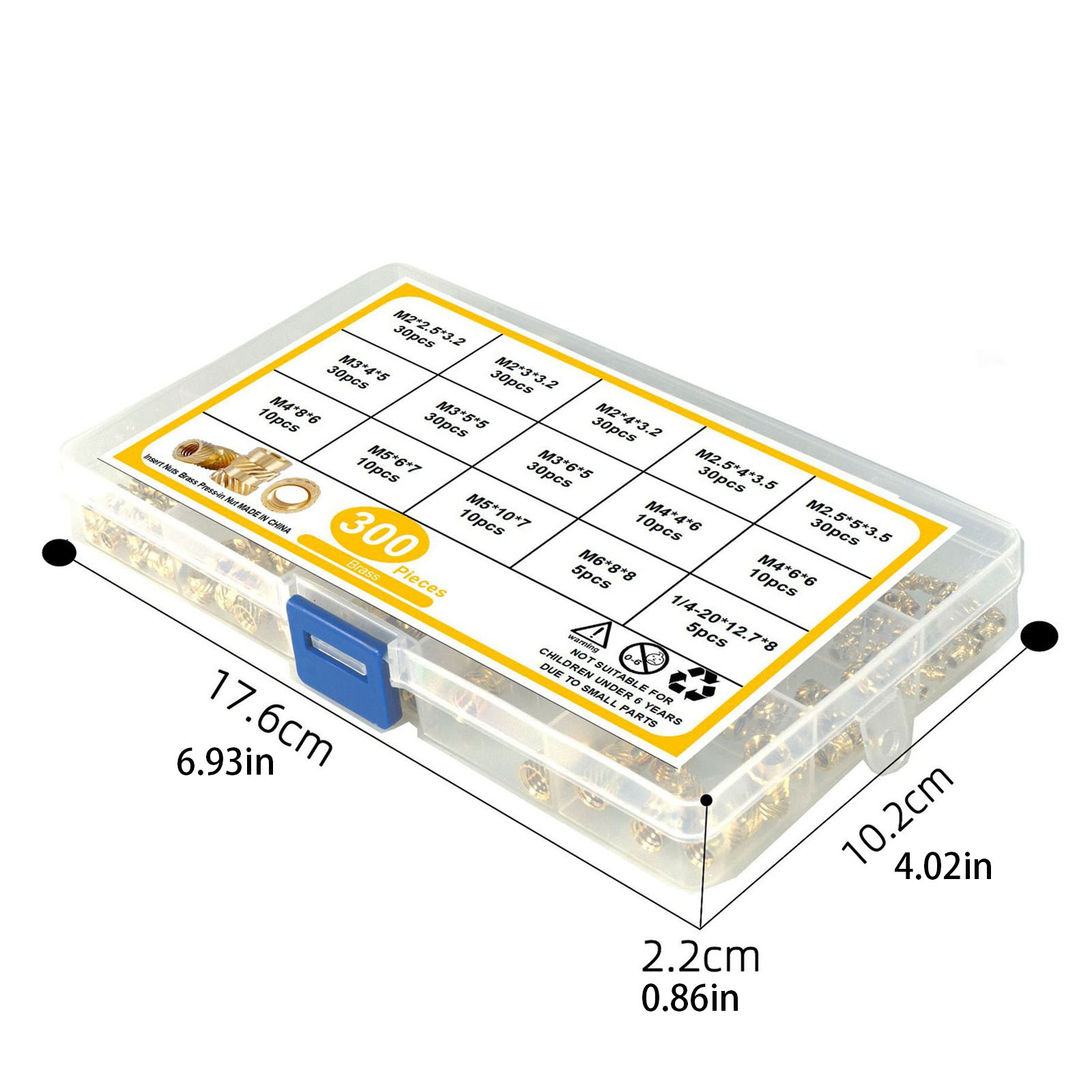 7 models and 15 sizes: (dimensions in mm) M2 x 2.5 x 3.2, M2 x 3 x 3.2, M2 x 4 x 3.2, M2.5 x 4 x 3.5, M2.5 x 5 x 3.5, M3 x 4 x 5 , M3 x 5. x 5, MM, 3 x 6 x 5, M4 x 4 x 6, M4 x 6 x 6, M4 x 8 x 6, M5 x 6 x 7, M5 x 10 x 7, M6 x 8 x 8, 1/4-20 x 12.7 x 8, 300 sheets in total.