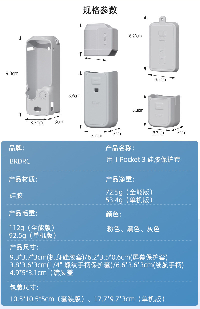 Product dimensions: 9.3 * 3.7 * 3cm (body silicone cover), 6.2 * 3.5 * 0.6cm (screen protector), 3.8 * 3.7 * 3cm (1/4 "threaded handle protector), 6.6 * 3.7 * 3cm (battery handle), 4.9 * 5 * 3.1cm (lens cover)