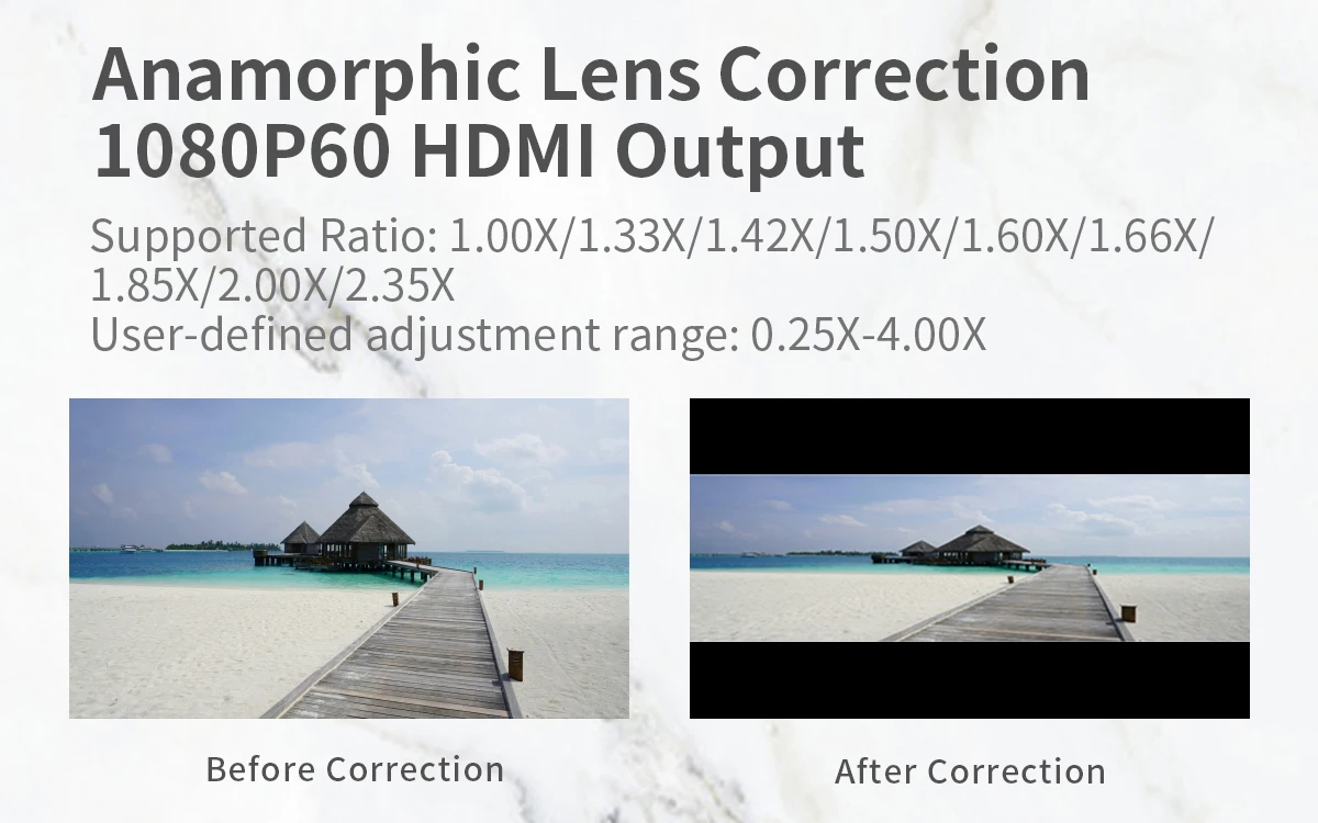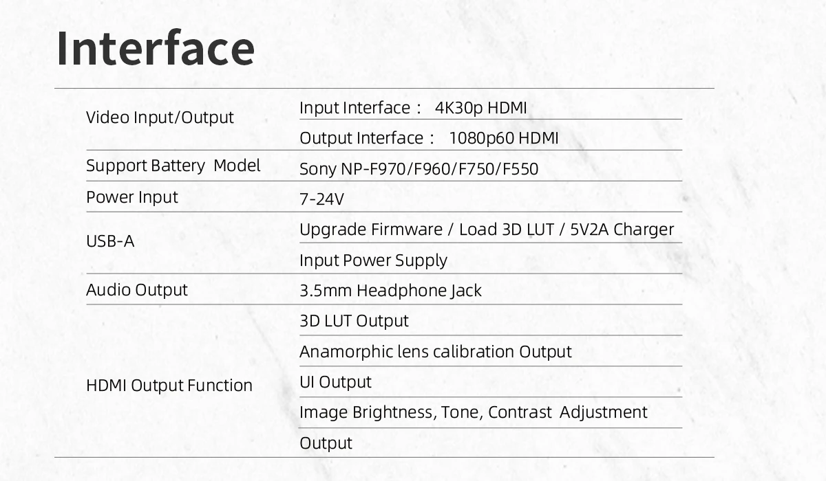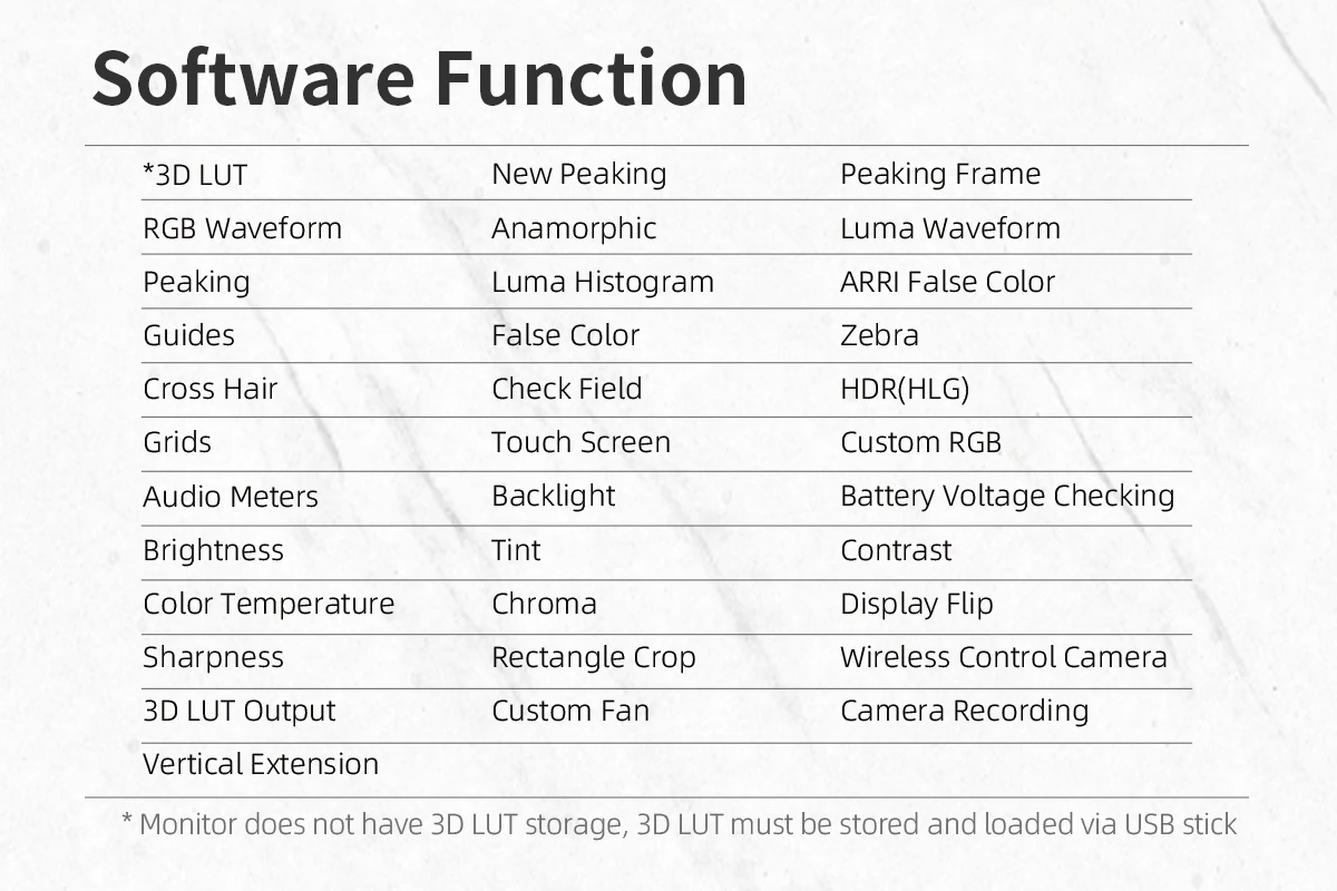 Custom Rectangular Image Crop, Customized Peaking Range(Peaking Frame) Anamorphic Lens Correction 1080P60 HDMI Output, Vertical Shooting Stretches Legs and HDMI Output, 3D LUT Output.