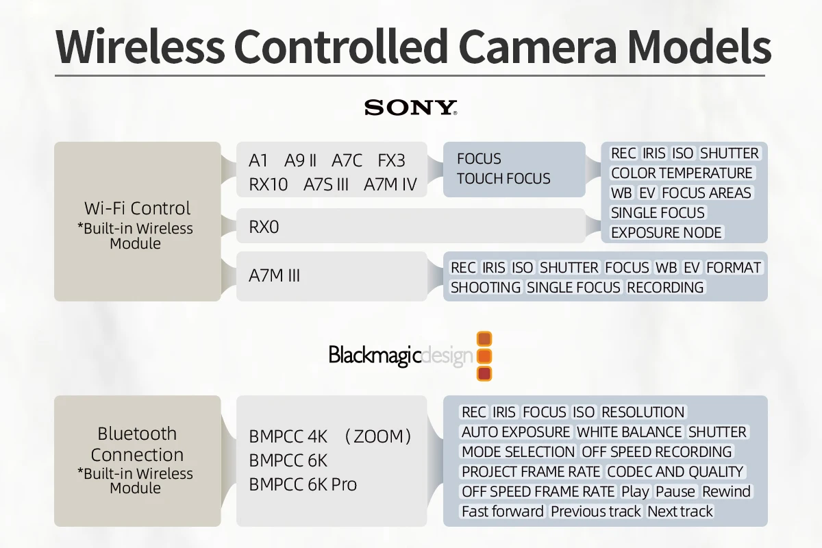 Wireless Control BMPCC 4K/6K/6K Pro, Sony Cameras.