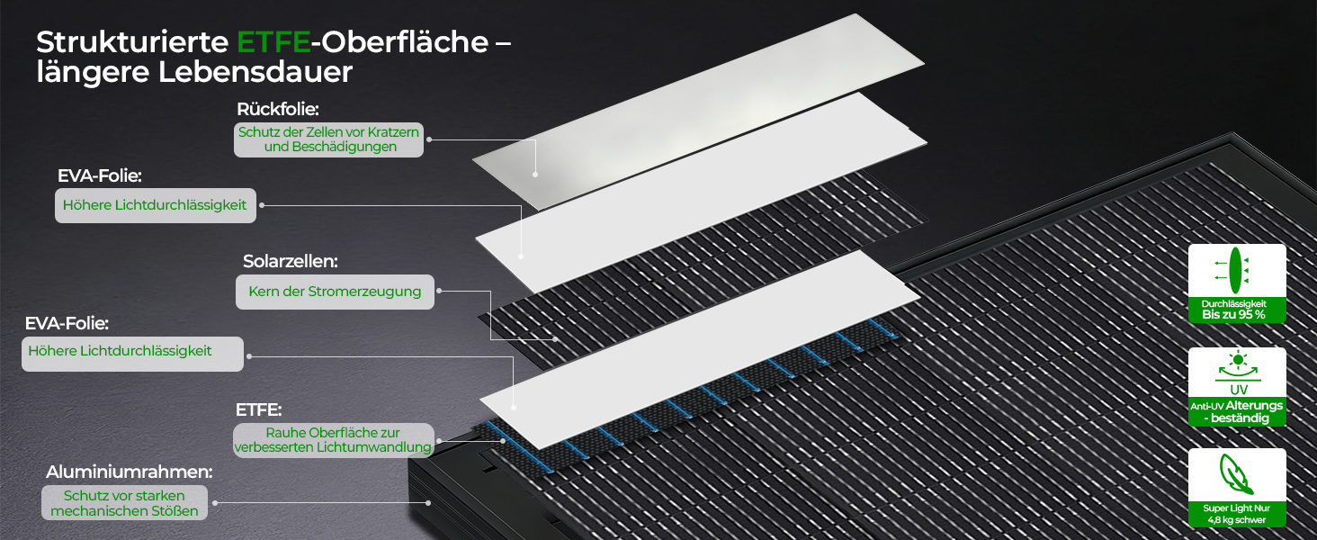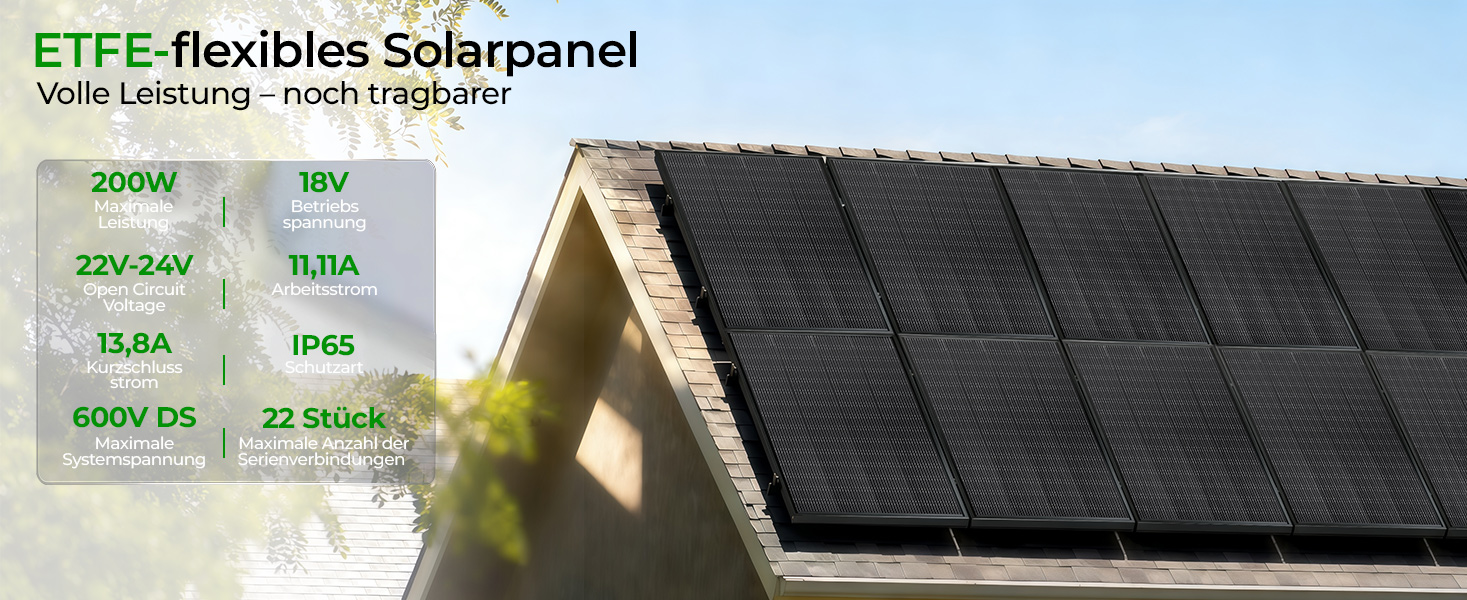 【Innovatives Design】 – Dieses innovative 200-W-Solarmodul mit ultraleichter, halbflexibler Struktur und hochwertigem Aluminiumrahmen ist der ideale Ersatz für herkömmliche, schwere Glasfaserpaneele. Mit nur 4,8 kg pro Stück problemlos einhändig zu transportieren, was die Installationskosten erheblich senkt. Gefertigt aus hochwertigem japanischem ETFE-Material, verbessert es die Umwandlungseffizienz und verlängert die Lebensdauer.