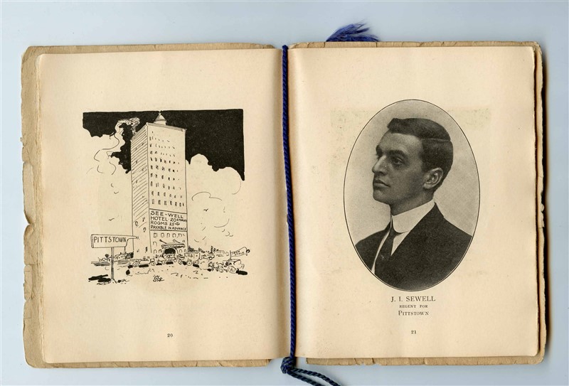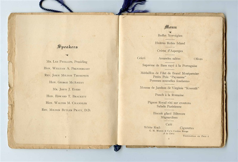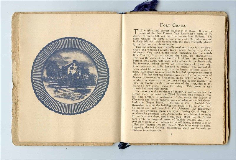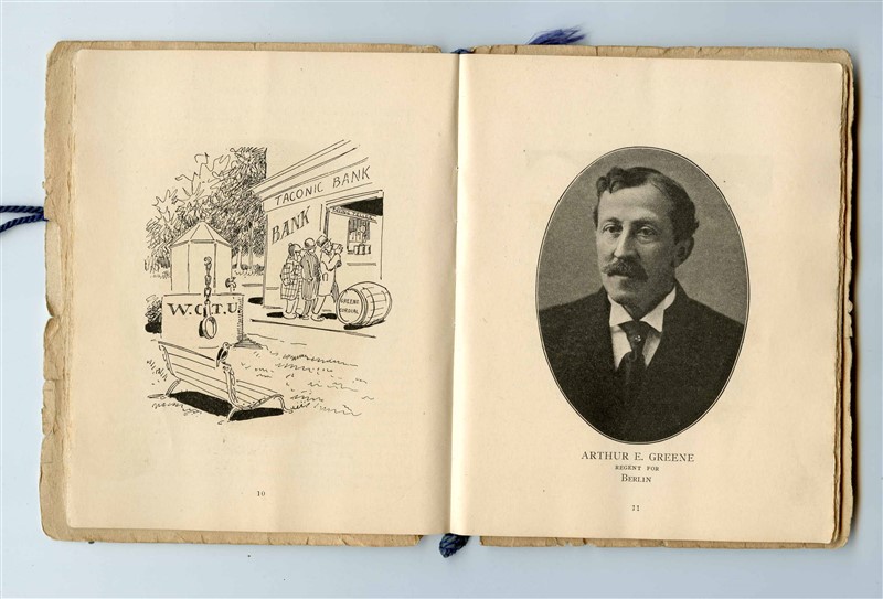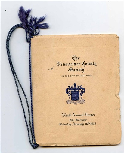 A 30 page menu and program from the Ninth Annual Dinner of the Rensselaer County Society in the City of New York. Held at the Biltmore Hotel in New York on Saturday evening, January 16th, 1915. Has an image of the Rensselaer County Society Crest on the cover. Includes lists of Officers, Directors and Regents for 1914-15, The Menu, a List of Speakers, and Article and Picture of Fort Grailo, and pages of photos of the Regents with cartoon images opposite those photos. has a list of entertainers, pages of words to songs and more. Has writing on the back inside page. The pages are held together with a darl blue cord. Measures about 4 3/4" x 6" when closed. .