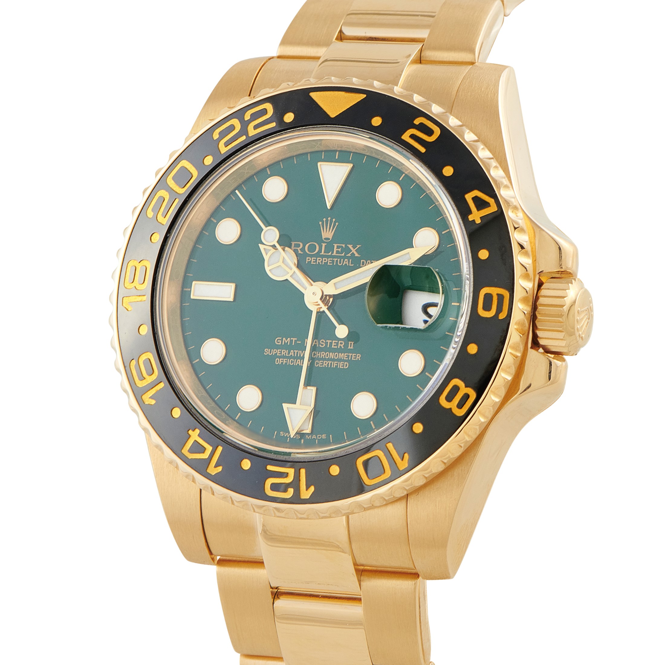 Debuting in 2005 for the GMT-Master anniversary, this green-dialed reference introduced the ceramic bezel to the manufacturer's lineup. Collectors originally met the vivid green dial with astonishment, though the piece soon became a prized rarity among enthusiasts. The 40mm yellow gold case contains the automatic 3186 movement, which employs a specialized alloy to resist magnetism. It sustains a 48-hour energy supply. A Triplock crown ensures 100 meters of water resistance.This is a pre-owned Rolex GMT-Master II Green Dial 18K Yellow Gold Watch 116718LN, accompanied by a gift box.
