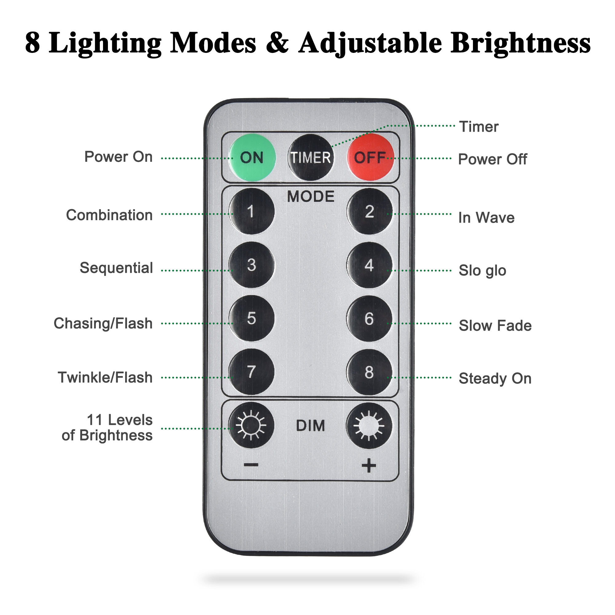 - 8 Lighting Modes & Adjustable Brightness - Gorgeous lighting modes including Combination, In Wave, Sequential, Slo Glo, Chasing/Flash, Slow Fade, Twinkle/Flash, and Steady On, 11 levels of brightness adjustable, providing dynamic effects for you to choose on different scenarios