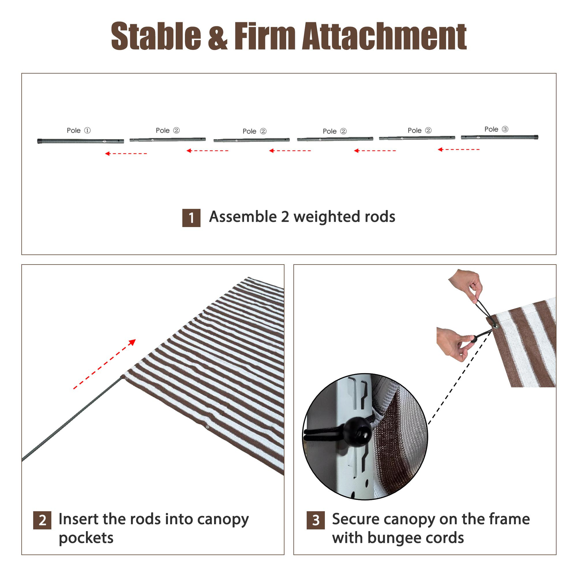 - Stable & Firm Attachment - Designed for easy and quick installation with two weighted rods and bungee cords, simply insert the weighted rod into canopy pockets and secure the canopy in place onto the pergola structure with bungee cords for stable attachment
