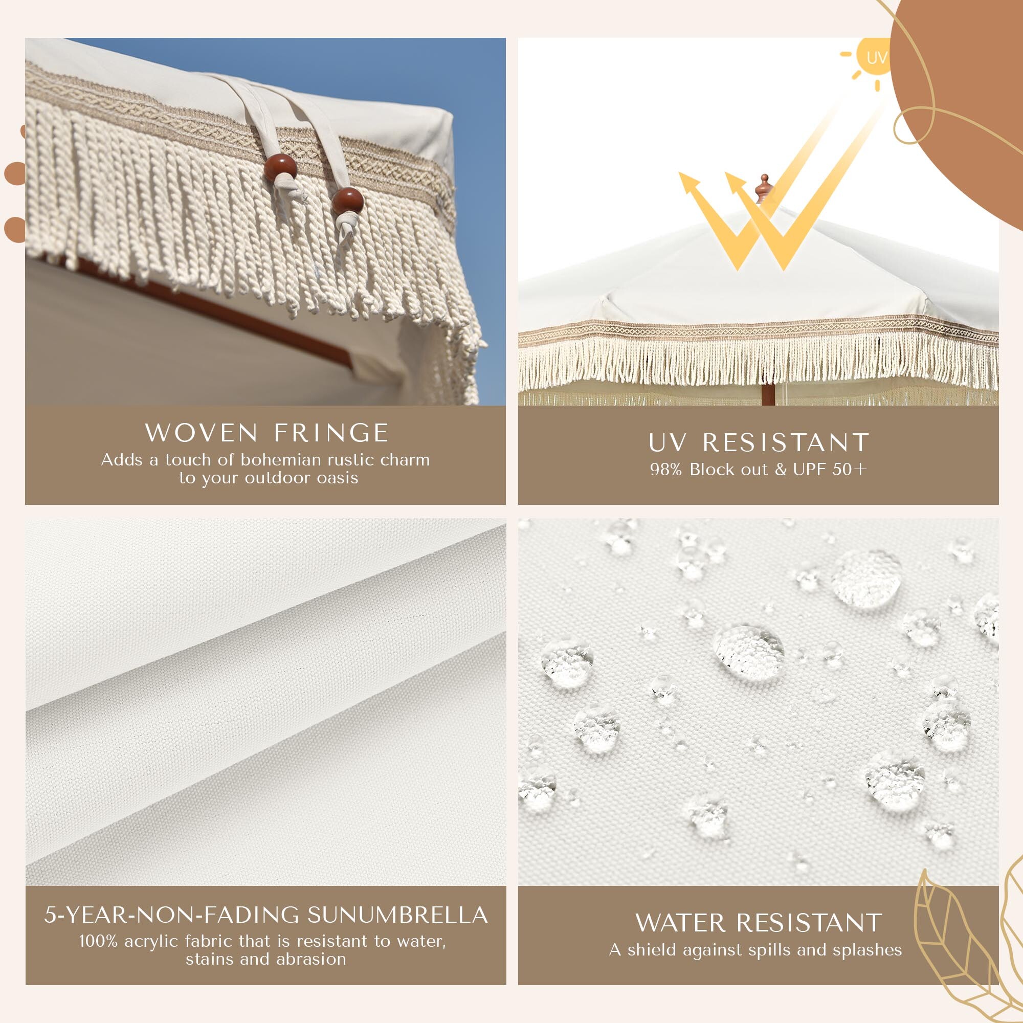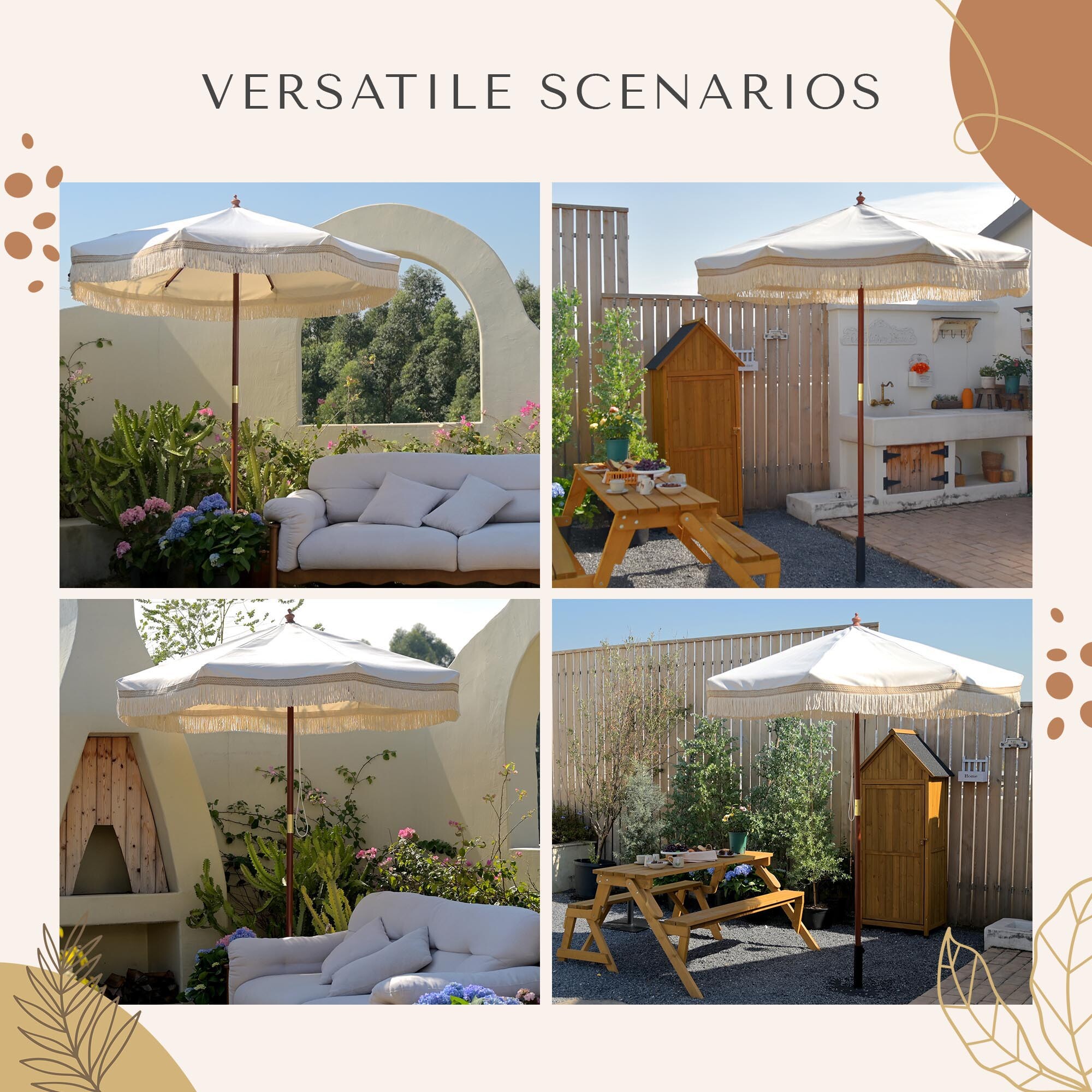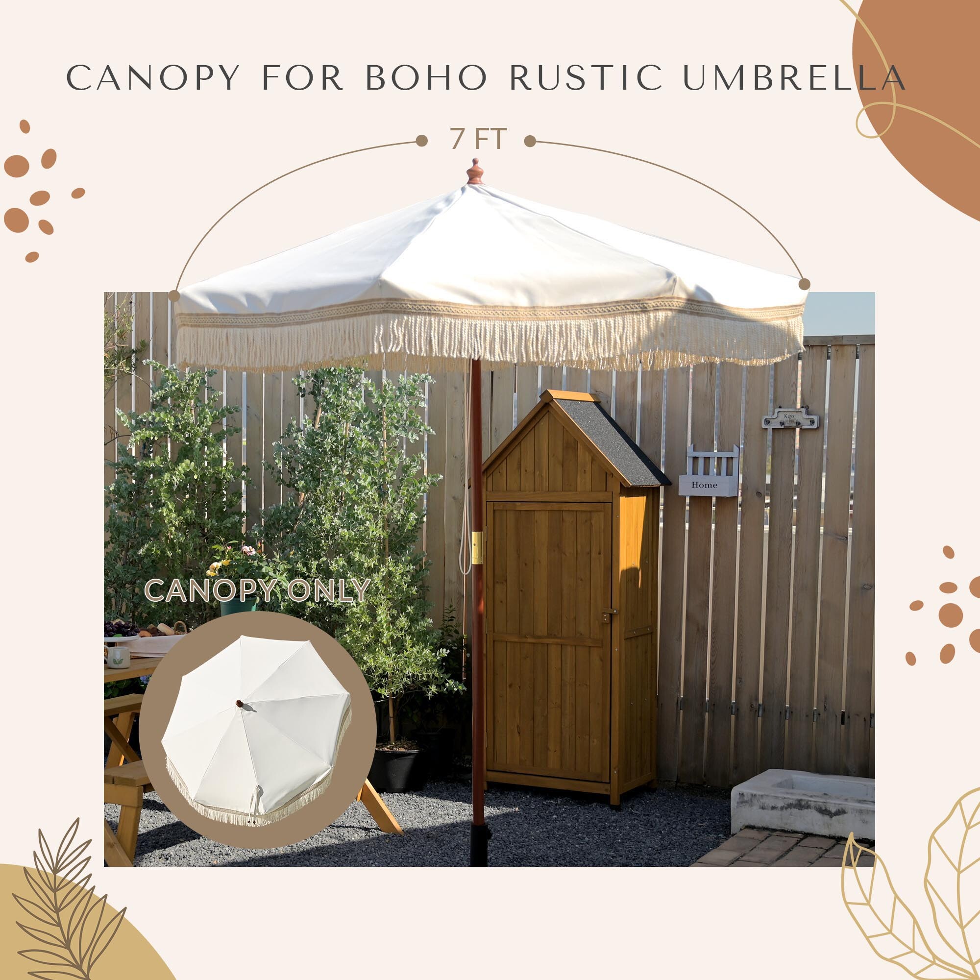 LAGarden 7 ft Boho Rustic Umbrella Replacement Cover fits 7 ft patio umbrella with 8 ribs to change your old umbrella with brand new top cover, boasting its cozy rustic style with beige color canopy and cotton fringes for creating a calm, relaxed vibe to any outdoor space.