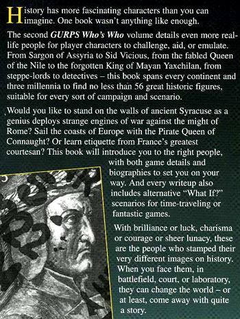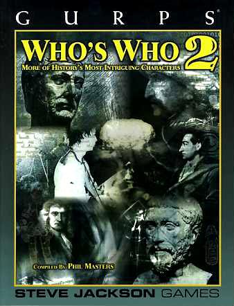 For sale is the Steve Jackson GURPS manualWho's Who 2 More of History's Most Intriguing Characters. It was produced in 1999 and features 128 pages of characters based on real historical persons - See the 2nd photo provided - pretty cool. Condition is Near-MINT: very strong color and binding, actual picture shown, free of pen/pencil markings; pages clean, neat & complete!