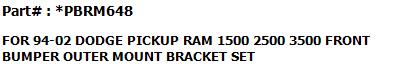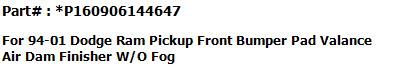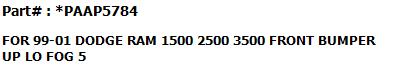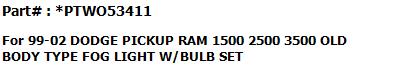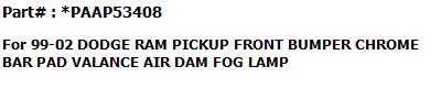 For 99-01 DODGE PICKUP RAM 1500 / 99-02 PICKUP RAM 2500 3500 (NOT FOR 99-02 SPORT PACKAGE) THIS LISTING IS WITH 7 PIECES FRONT BUMPER CHROME FRONT BUMPER COVER UPPER MATERIAL BLACK (WITH CLIPS, SNAP TO STEEL BUMPER DIRECTLY) FRONT BUMPER COVER LOWER TEXTURED DARK GREY (WITH CLIPS, SNAP TO STEEL BUMPER DIRECTLY) FOG LAMP W/BULB LH FOG LAMP W/BULB RH FRONT BUMPER OUTER MOUNTING BRACKET LH FRONT BUMPER OUTER MOUNTING BRACKET RH |