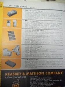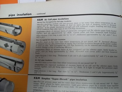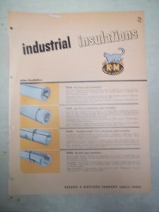Up for sale is a trade catalog put out by the Keasbey & Mattison Co. featuring Industrial Insulations, undated but circa 1945. States the inclusion of asbestos in one of their pipe insulations products, block insulation and also Asbestos Paper and Millboard, Rope and Wick Packings and ebonzied asbestos. Provides feature descriptions, general specifications and illustrations. Contains 4 pages. Fair condition, a tear along the top edge. This is an original document.