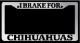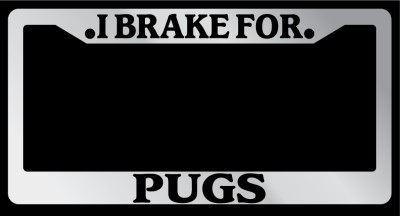 I Brake For Pugs Chrome license plate frame made from high impact ABS plastic, chrome plated, and covered with color vinyl printing. - This frame is designed to last. Steel chrome frames when they get scratched will rust and rot away.