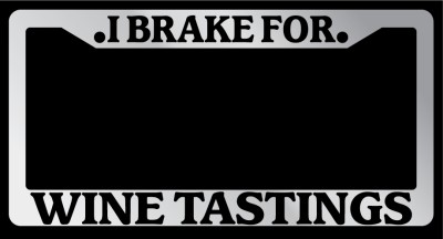 I Brake For Wine Tastings Chrome license plate frame made from high impact ABS plastic, chrome plated, and covered with color vinyl printing. - This frame is designed to last. Steel chrome frames when they get scratched will rust and rot away.