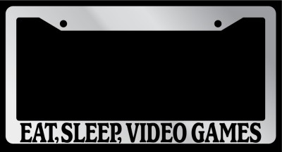 Eat, Sleep, Video Games Chrome license plate frame made from high impact ABS plastic, chrome plated, and covered with color vinyl printing. - This frame is designed to last. Steel chrome frames when they get scratched will rust and rot away.