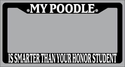 My Poodle Is Smarter Than Your Honor Student Black license plate frame made from high impact ABS plastic, covered with color vinyl printing.
