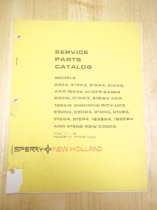 Up for sale is a factory issued Service Parts Catalog for the Sperry New Holland Auger Bases, Windrow Pick-Ups and Row Crop Models as seen in photo. Very good used condition, dirty cover and tear to bottom left corner of cover as seen in photo. This is an original document. I will be sure to pack for safe shipment.