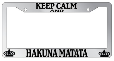 Keep Calm And Hakuna Matata Chrome license plate frame made from high impact ABS plastic, chrome plated, and covered with color vinyl printing. - This frame is designed to last. Steel chrome frames when they get scratched will rust and rot away.
