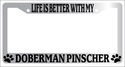 Life Is Better With My Doberman Pinscher (Paws) Chrome license plate frame made from high impact ABS plastic, chrome plated, and covered with color vinyl printing. - This frame is designed to last. Steel chrome frames when they get scratched will rust and rot away.