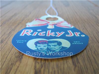 This tag is NOT the one for the larger 21 inch tall dolls that were made in 1953 and 1954 ( first issues). This tag is for the one piece torso dolls only. See my other auctions for the first issue tag for the jointed Ricky, Jr. This tag shows Lucy and Desi as well on the front of the tag. NOTE: The EBAY enlarging feature blurs my photo. Tag is clearly printed, not blurry. If you have a Ricky, Jr. doll this is a good replacement for the original item that came in the box with him. It is printed on professional acid free card stock. This is a great reference or replacement item for your doll collection.
