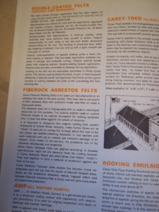 Up for sale is a trade catalog put out by the Philip Carey Corporation featuring Built-Up Roofing Materials dated 1969. Cites the use of asbestos in some of their flashing and felts. It provides feature descriptions and illustrations. Very good condition. Removed from a large reference catalog, 20 pages in all. I will combine shipping, let me know at check-out. This is an original document.