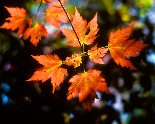 I knew the exact spot I wanted to photograph at. It was a long hike through the woods. There was a heavy forest canopy overhead that the sun would shine through like a spotlight. I was walking swiftly not paying much attention to the area around me. I happened to glance to my left and saw this spotlight of sun lighting these orange leaves with a contrasting background of green leaves and blue sky. I shot this with a very shallow depth of field to allow the leaves to pop off the out of focus background. How does that saying go? "It's not the destination it's the journey"