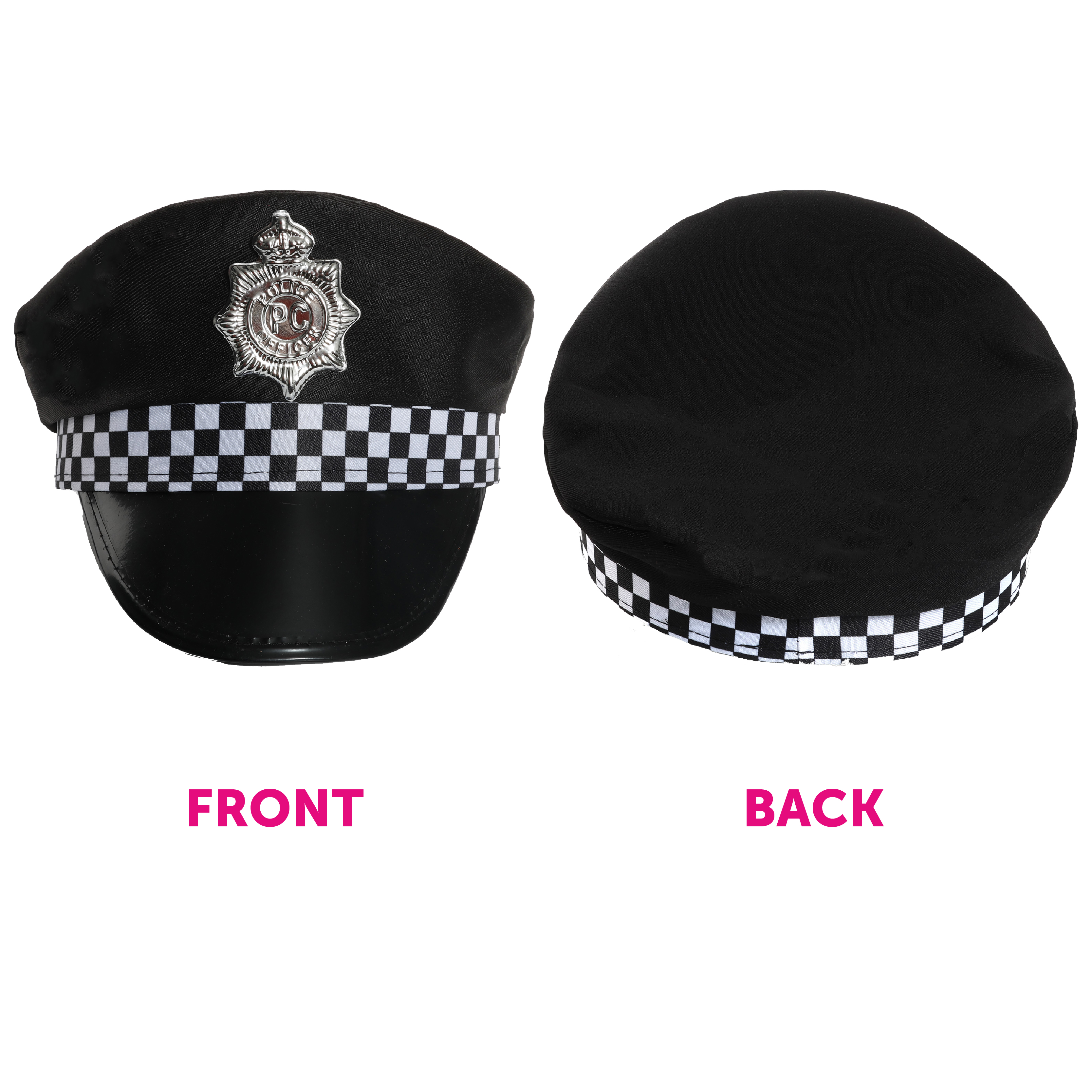 POLICE HAT DETAILS: This Child's Police Hat is a Black material Cap, with a firm Black Visor, a Black and White Checkered pattern around the crown and a Silver Police Badge on the front, the perfect addition to your Police Costume!