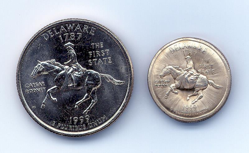 Uncirculated Delaware Quarter This is a genuine uncirculated Delaware state quarter that has been electromagnetically "shrunk" by extremely powerful magnetic fields. Using specialized equipment in my high voltage lab, I created invisible, but very intense, pulsed magnetic fields which "hammered" the outer rim of the coin inwards, evenly shrinking it to the diameter of a dime. The whole process only took 20-25 millionths of a second, and was accompanied by an explosion and a blinding blue-white flash! Technical details will be provided in a one-page summary supplied with the coin. Shrunken coins are an amazing demonstration of the incredible power of ultrastrong magnetic fields.