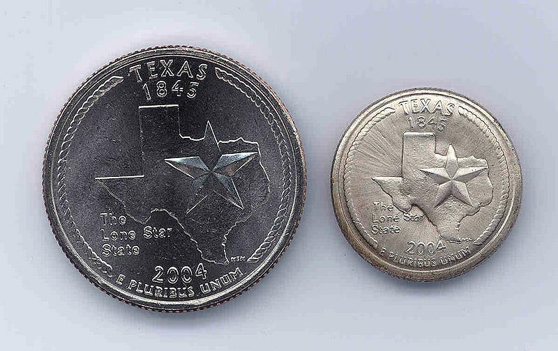 Uncirculated Texas Quarter This is a genuine uncirculated Texas state quarter that has actually been "shrunk" by extremely powerful magnetic fields. Using specialized equipment in my high voltage lab, I created an invisible, but extremely intense, pulsed magnetic field which "hammered" the outer rim of the coin inwards, evenly shrinking it to the diameter of a dime. The whole process only took 20 millionths of a second, and was accompanied by an explosion and a blinding blue-white flash! Technical details will be provided in a one-page summary that ships with the coin. Shrunken coins are an amazing demonstration of the incredible power of ultrastrong magnetic fields.