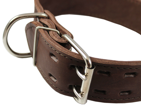 This fabulous double ply 100% genuine leather 1.75" wide dog collar is made of high quality two layers leather. High quality hardware make this a very fine leather product. Heavy duty, strong and durable, elegant and beautiful. You and your dog will enjoy it for a long time. Lined with genuine leather for maximum comfort.