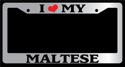 Chrome Metal license plate frame I HEART MY MALTESE made from high quality steel plated in chrome, covered with premium outdoor color vinyl printing with a minimum life expectancy of 7 year. The vinyl is designed to stand up to the elements and will not peel off in car washes or other elements your car may be subjected to.