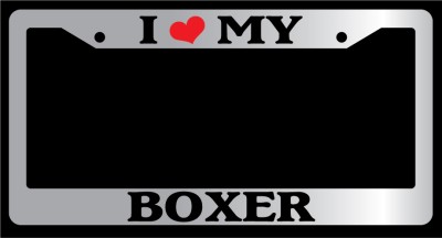 Chrome Metal license plate frame I HEART MY BOXER made from high quality steel plated in chrome, covered with premium outdoor color vinyl printing with a minimum life expectancy of 7 year. The vinyl is designed to stand up to the elements and will not peel off in car washes or other elements your car may be subjected to.