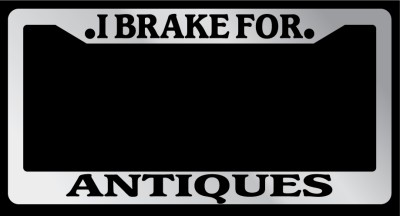 Chrome Metal license plate frame I BRAKE FOR ANTIQUES made from high quality steel plated in chrome, covered with premium outdoor color vinyl printing with a minimum life expectancy of 7 year. The vinyl is designed to stand up to the elements and will not peel off in car washes or other elements your car may be subjected to.