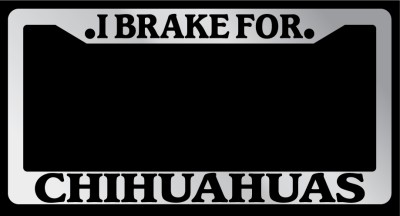 Chrome Metal license plate frame I BRAKE FOR CHIHUAHUAHS made from high quality steel plated in chrome, covered with premium outdoor color vinyl printing with a minimum life expectancy of 7 year. The vinyl is designed to stand up to the elements and will not peel off in car washes or other elements your car may be subjected to.