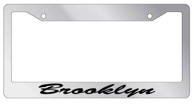 Chrome Metal license plate frame BROOKLYN CURSIVE made from high quality steel plated in chrome, covered with premium outdoor color vinyl printing with a minimum life expectancy of 7 year. The vinyl is designed to stand up to the elements and will not peel off in car washes or other elements your car may be subjected to.