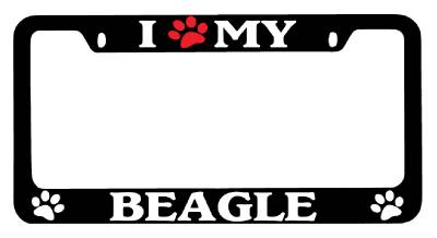 Black Metal license plate frame I Heart My (Paw) Beagle made from high quality steel, covered with premium outdoor color vinyl printing with a minimum life expectancy of 7 year. The vinyl is designed to stand up to the elements and will not peel off in car washes or other elements your car may be subjected to.
